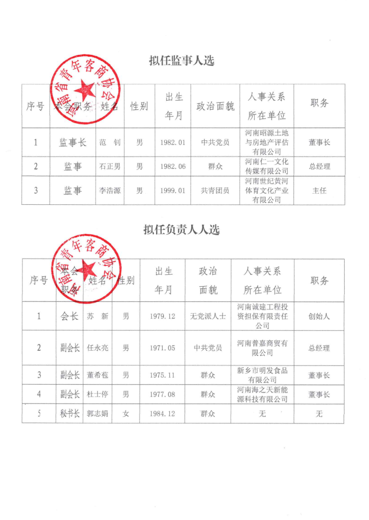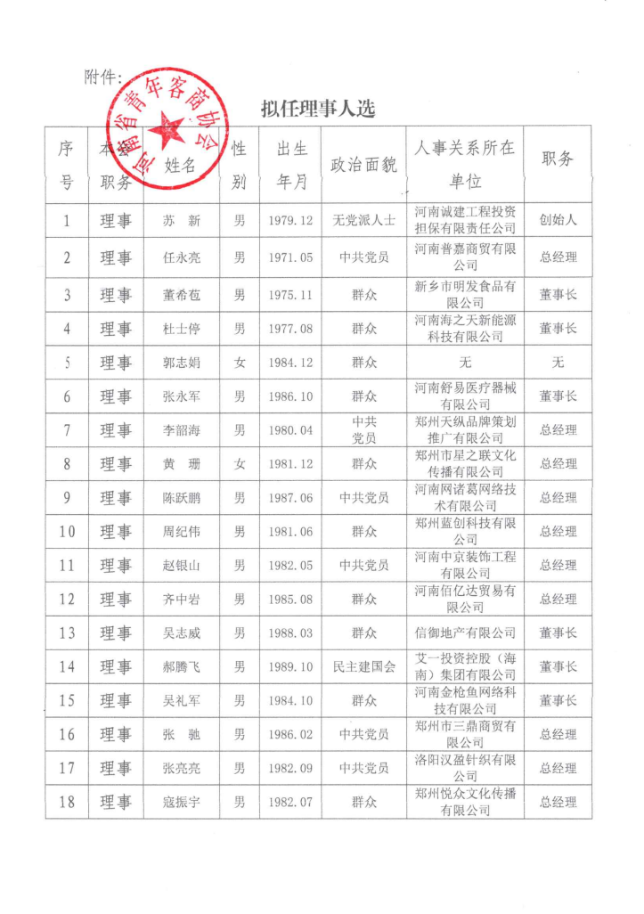 【摘要】为进一步加强协会组织建设,凝聚青年客商力量,根据《河南省青年客商协会章程》及相关管理规定,现将新一届理事会、监事会及负责人拟任名单予以公示。具体内容如下: